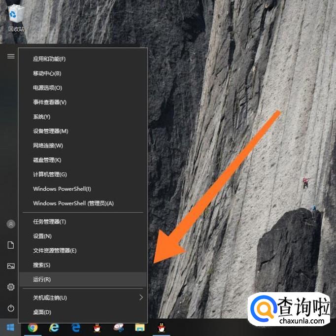 首先右击桌面左下角的“开始”菜单图标,然后点击“运行”。