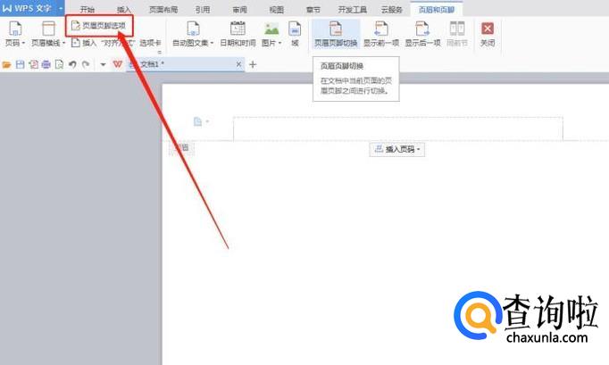 点击“页眉页脚”后,我们会发现编辑区出现页眉区域和页脚区域,我们在第二行当行栏中找到“页眉页脚选项”然后点击进入,如图所示: