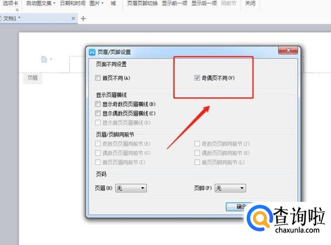进入后会显示如下如所示的设置对话框,这时我们在“奇偶页不同”选项上,打对号。如图所示: