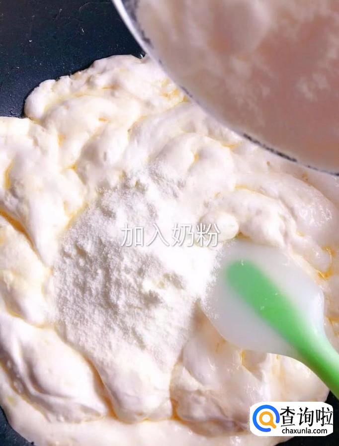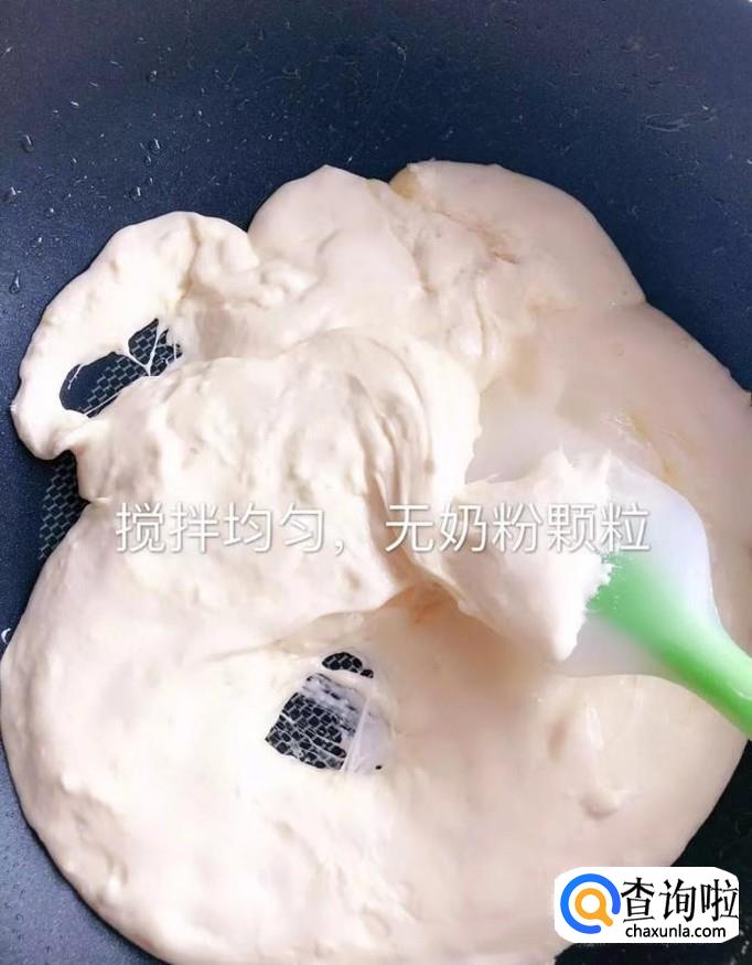 然后把锅中的食材翻拌均匀,大概翻拌到没有奶粉颗粒就可以了。