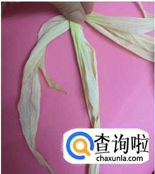 把玉米外面的老叶子去掉,留下嫩一些的,凉晒到微微变黄,叶子柔软的程度,并将顶端连接根部的地方减掉,便于编平整。