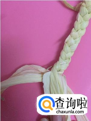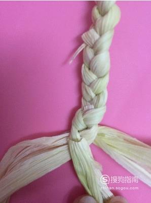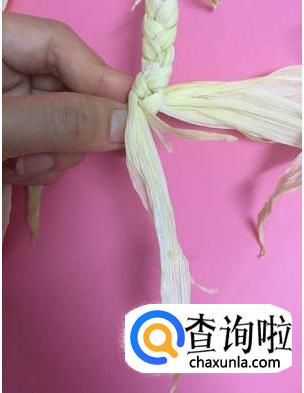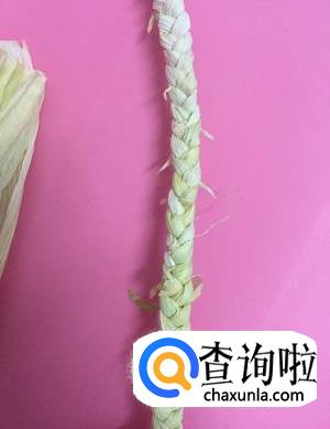 编到其中一股剩下一小段的时候,撕开一片叶子,垫在下面。