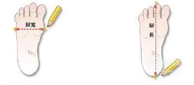 然后用尺子量出脚的最长距离和最宽距离即可。