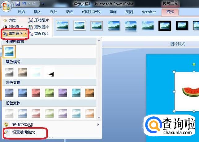 点击功能区的“重新着色”,会弹出扩展项,我们看到底部有一个“设置透明色”按钮,我们点击一下。
