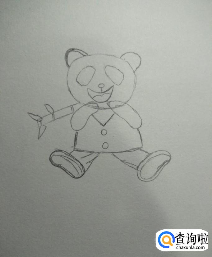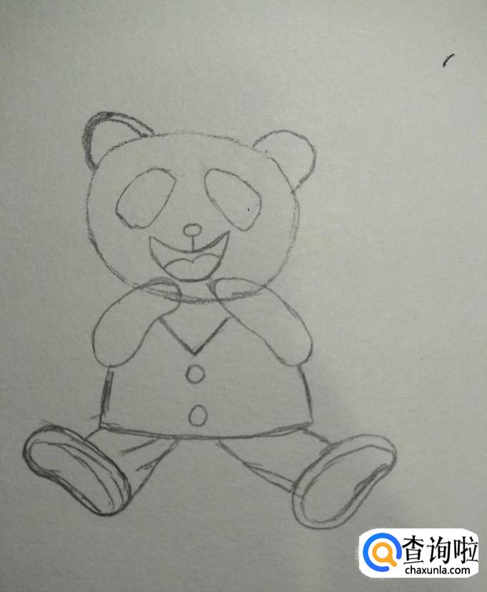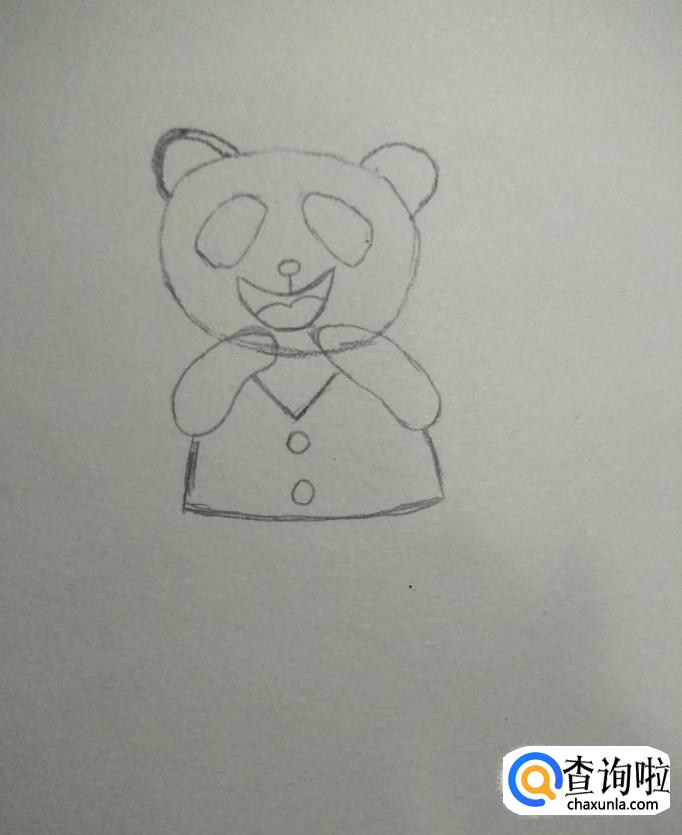 顺着两只手在手的下方画一个尖角,将其作为熊猫衣服的衣领,然后顺着手肘拉两条下划线