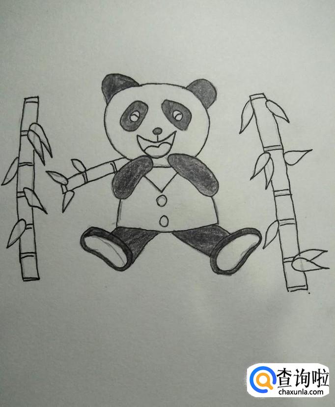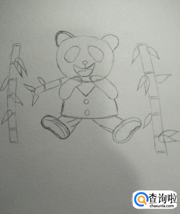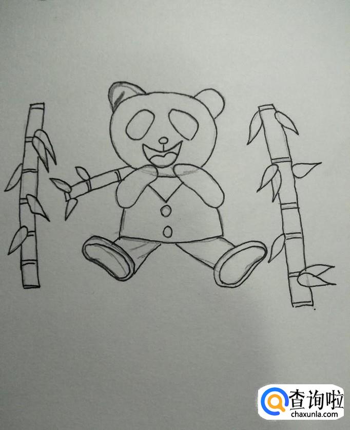 在熊猫的右手边画一根竹,然后在其左右两边画两根立着的竹,如下图所示。到此,整个熊猫的轮廓我们就画好了