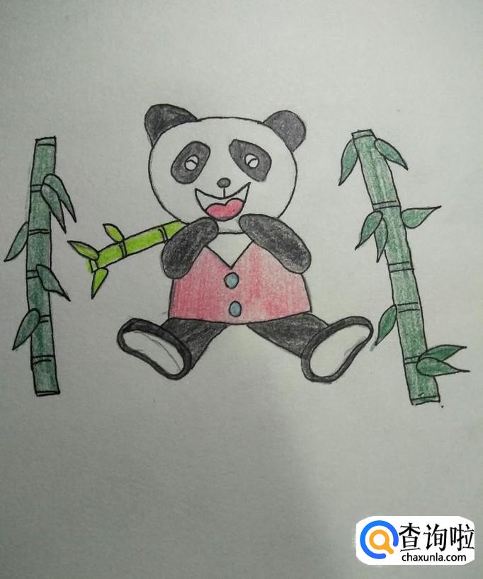 将熊猫的耳朵,眼睛,手和脚用黑色的蜡笔涂抹,衣服和嘴涂上红色的蜡笔,手中的竹子用蜡笔涂成嫩绿色,两边立着的竹子涂成绿色,就OK了
