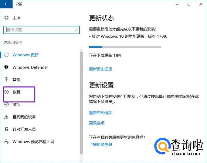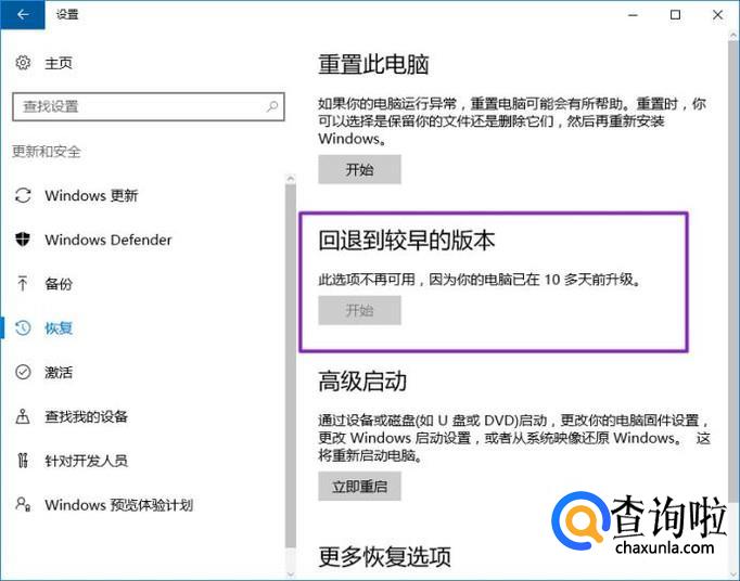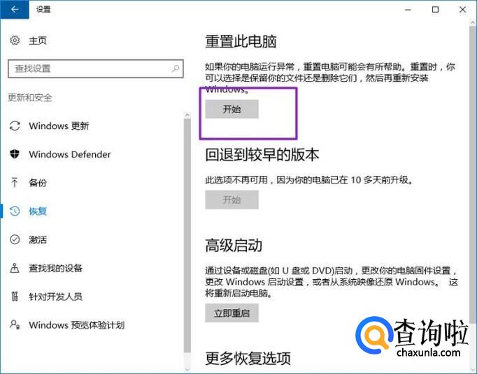 弹出的界面,有个选项是:回退到较早的版本,如果我们没有在10天前进行升级的话,是可以点击这个选项,然后点击开始进行重装系统的;