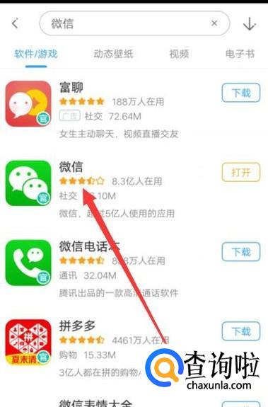 进入之后,在搜索框中搜索“微信”,然后点击微信,如图所示。