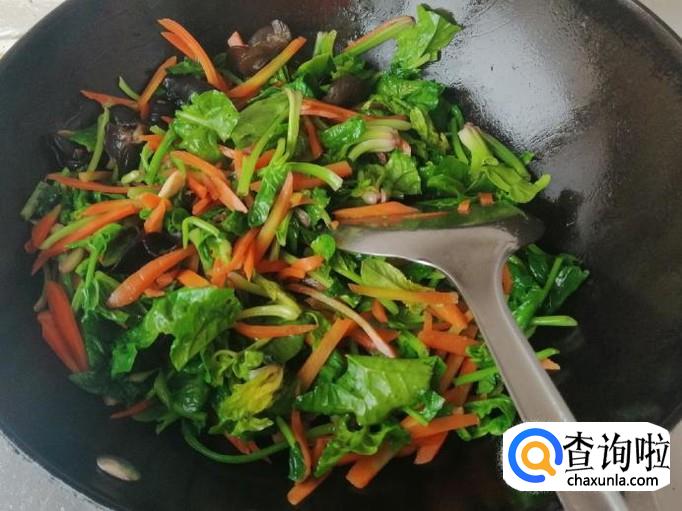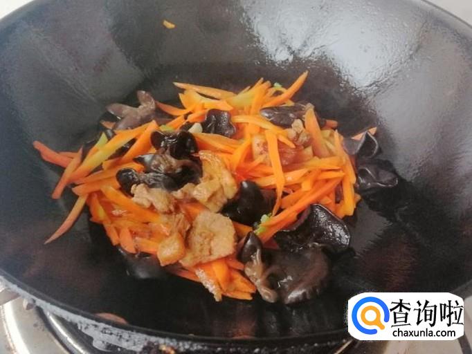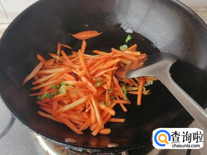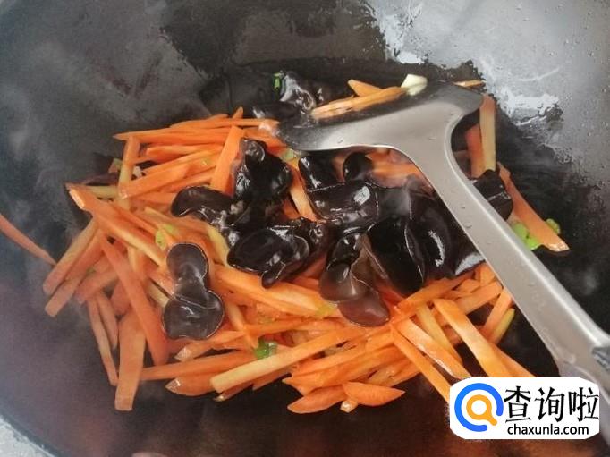 炒锅放油,油热后放入切好的葱花、辣椒、蒜炝锅,炒出香味后放入备好的胡萝卜丝,用铲子翻炒均匀,然后加入木耳,继续翻炒均匀。