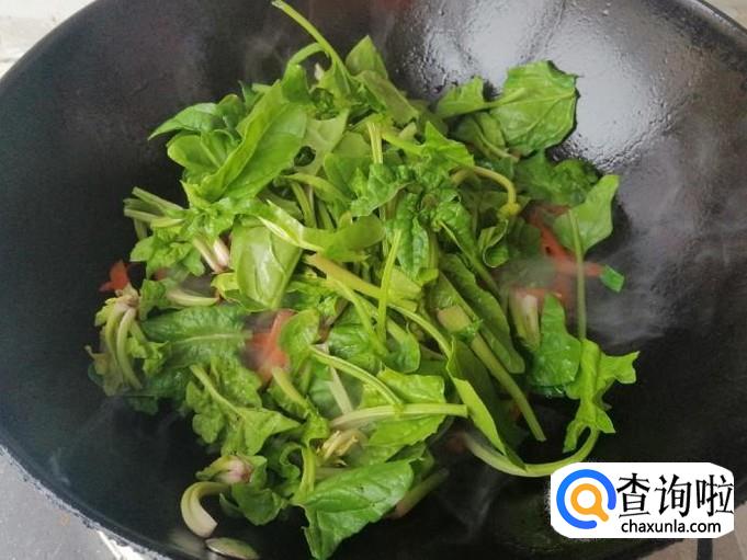 稍炒片刻后加入熟猪肉,再加入备好的菠菜,用铲子快速翻炒均匀,待菠菜变软后,加入适量生抽和食盐,搅拌均匀就可以了。
