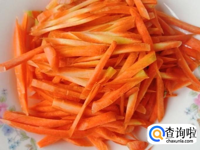 取适量胡萝卜,用清水把胡萝卜洗净,然后把洗净的胡萝卜放在菜板上,用刀把胡萝卜切成细丝,切好待用。