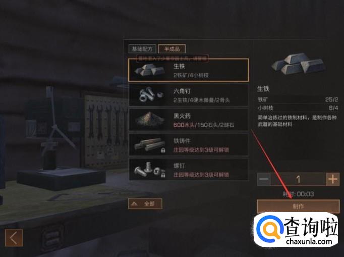 最后再在【武器制作】→【半成品】页面选中生铁,接着点击【制作】功能,这样就完成生铁的制作了。