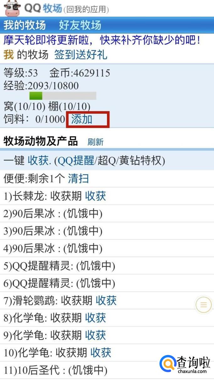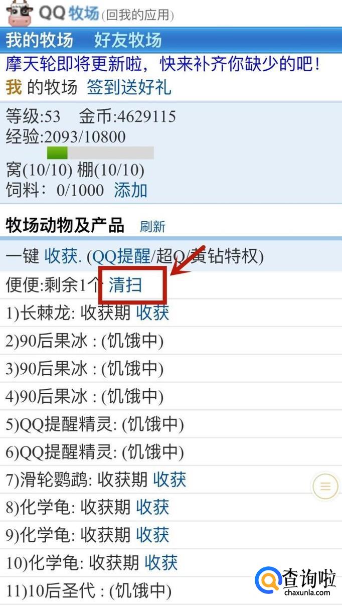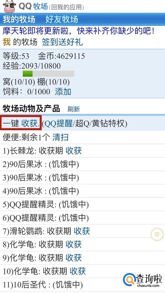 接着点击一键收获可以收取我们qq牧场的农副产品。
