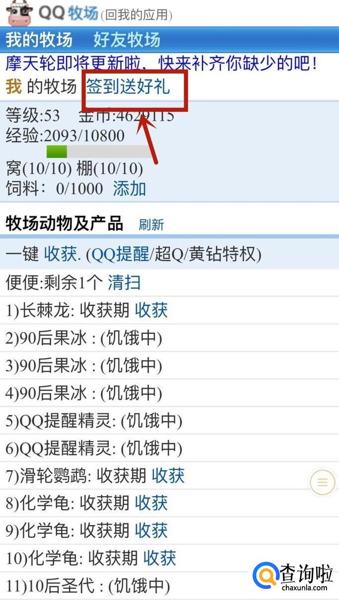 然后点击签到送好礼可以进行QQ牧场签到,如下图所示。