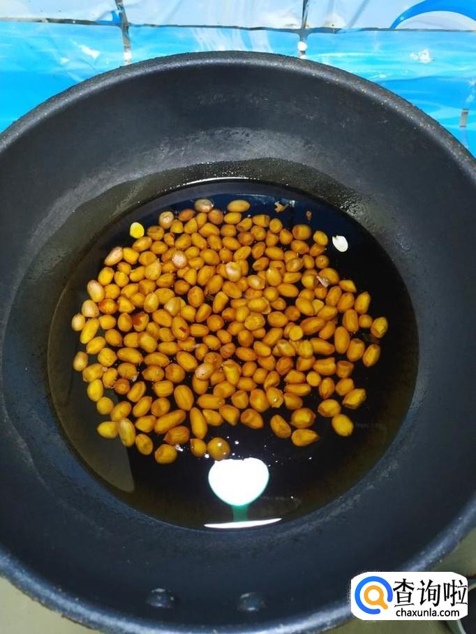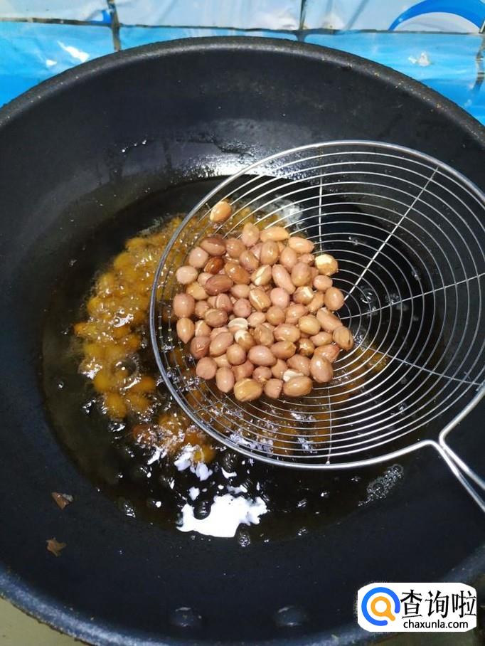 准备适量花生米,洗净后,沥干水分,炒锅中放入适量油,凉锅凉油,将花生米放入锅中,小火慢炸,炸熟后,捞出放入盘中,自然放凉。
