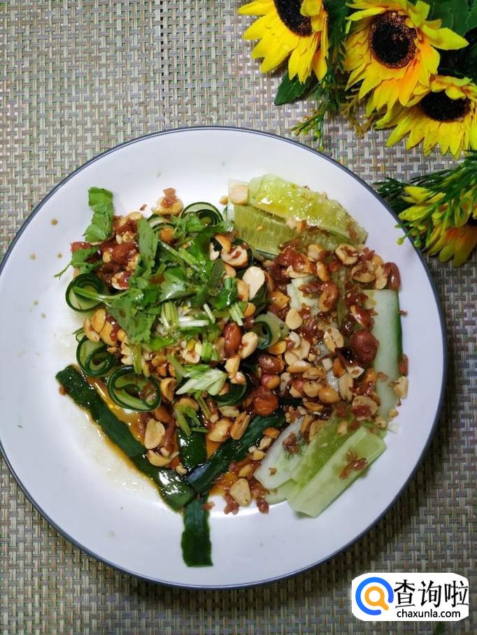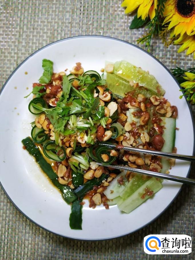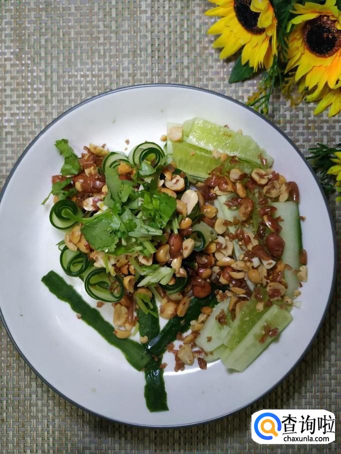 黄瓜适量,花生适量,大蒜适量,盐适量,鸡精适量,五香粉适量,生抽适量,陈醋适量,香油适量,辣椒油适量,香菜适量,白砂糖适量。
