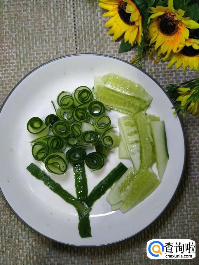 全部卷好之后,放在盘中,然后用黄瓜皮做成树的枝干,多余的黄瓜切成条,放入盘中,摆放整齐。