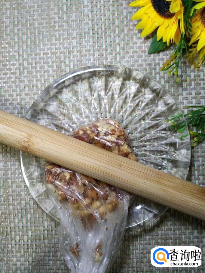 等到花生米彻底放凉之后,将花生米放入保鲜袋中,然后用擀面杖擀碎,放到黄瓜上面。