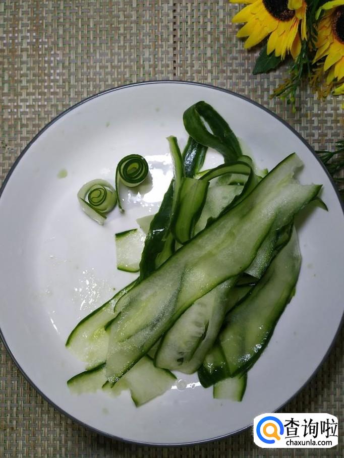 准备一根水果,黄瓜洗净后,用削皮刀削成薄片,然后将薄片从一头卷起来,如图所示。