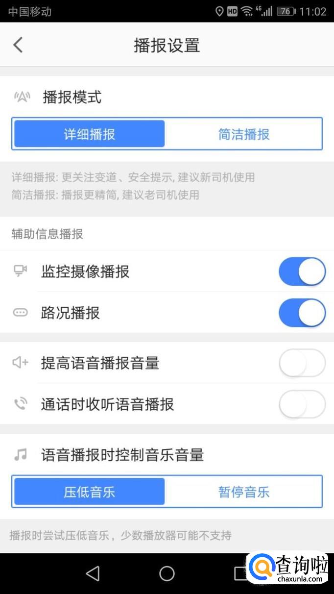 进入“播报设置”最下方,选择“语音播报时控制音乐音量”里面的两个选项,选择你自己需要的点击即可。