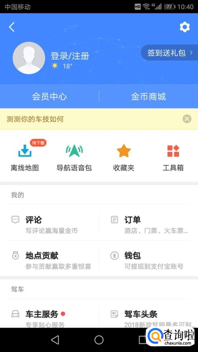 首先,在手机上下载并安装一个导航,如图,我们以“高德地图”这个导航为例。安装好进入导航,左上角有个人物头像的标志,点击进入。