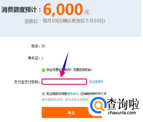 点击开通花呗按钮,进行个人信息确认,输入支付宝的"支付密码"授权给花呗。