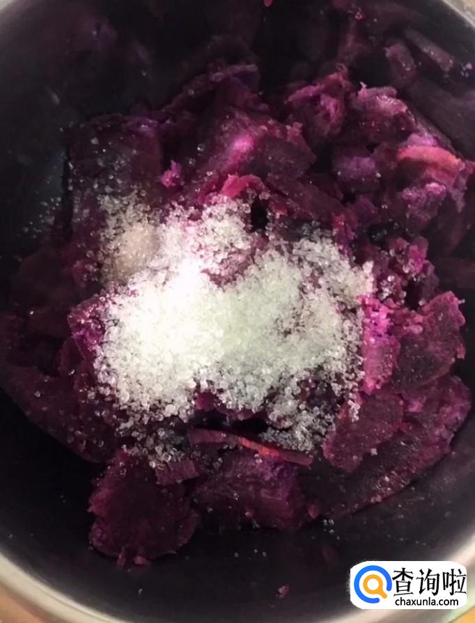 蒸熟以后取出来放入一个盆中,加入适量的白糖,用勺子把它压成泥