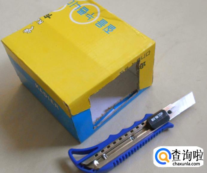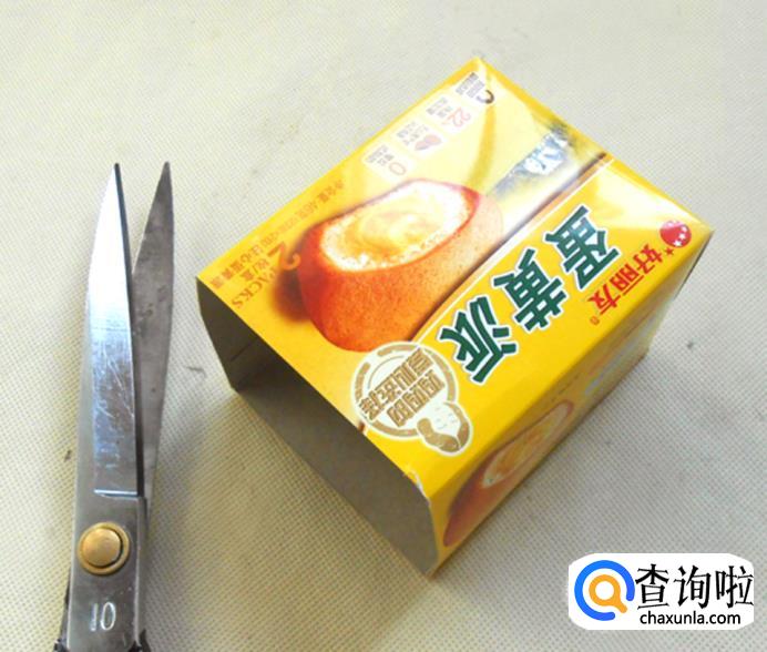 再找一个略大一些的纸盒,同样用剪刀把一端的盒盖剪掉: