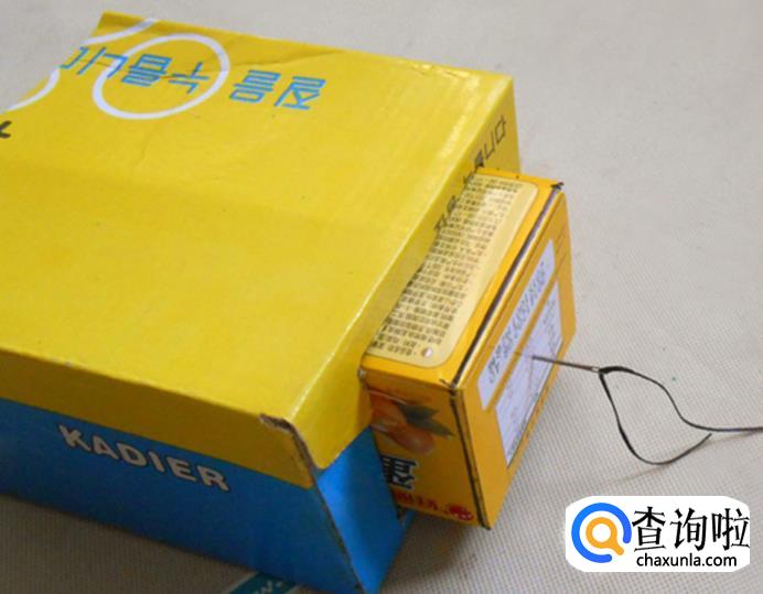 把小纸盒粘贴保鲜袋的那一端从缺口塞进大纸盒里,小纸盒的一端用缝衣针扎个小孔: