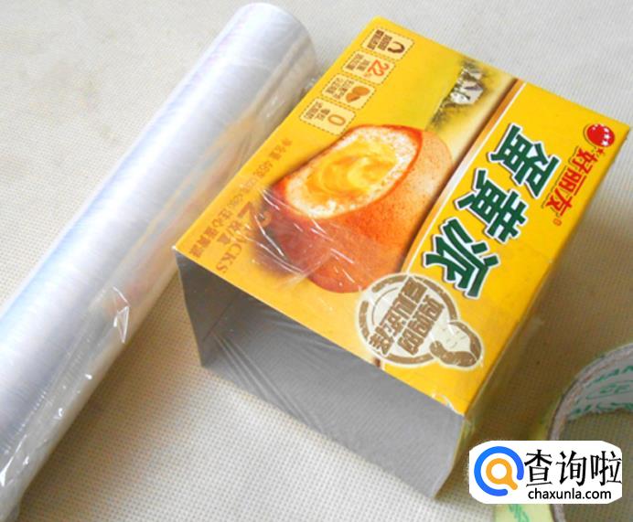 然后找一只塑料保鲜袋,就是超市里卖的那种装食品的保鲜袋,白色半透明的,用剪刀剪下一层塑料薄膜,蒙在纸盒的开口上,四周用透明胶带粘牢: