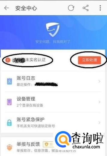 点开安全中心之后,未实名认证,显示立即处理,