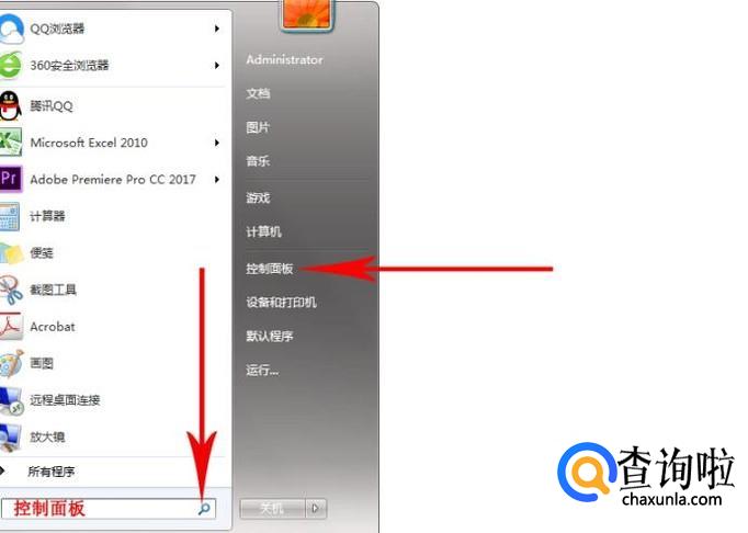 点击开始菜单,再点击箭头标注的“控制面板”选项(也可以在左下角搜索框输入“控制面板”搜索找到并进入)
