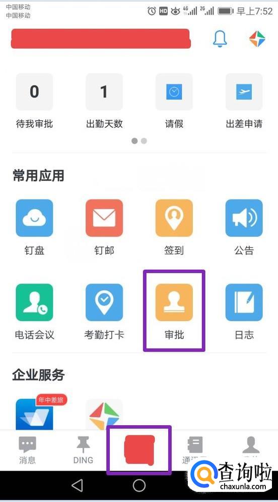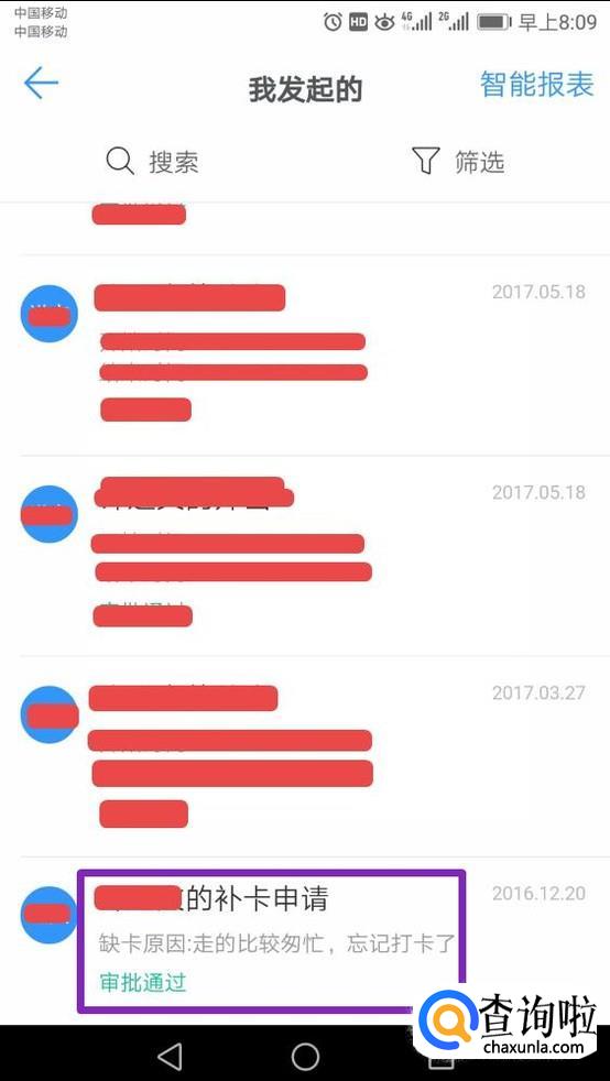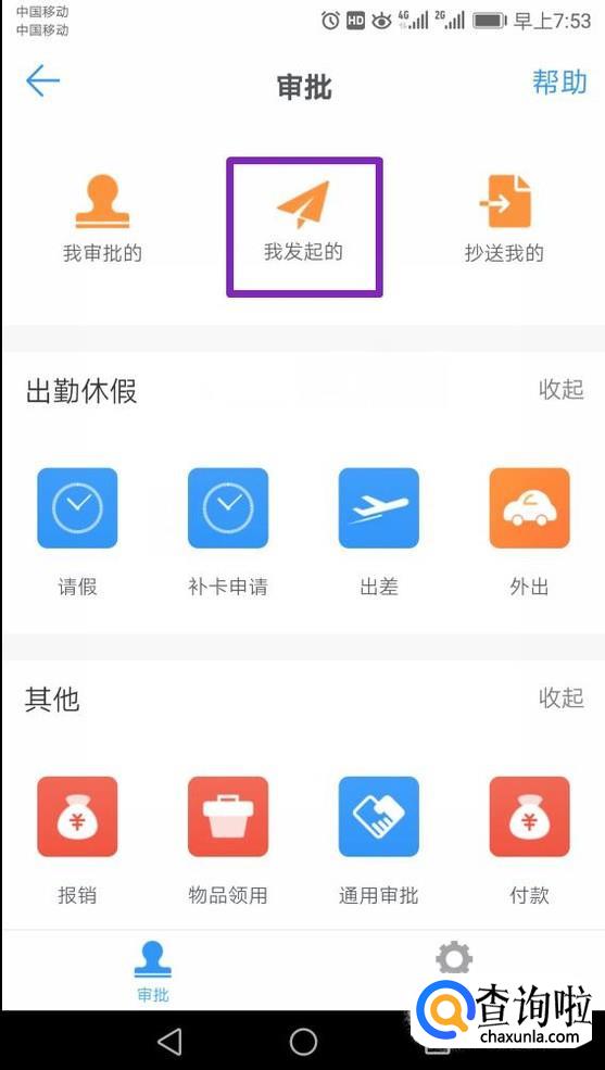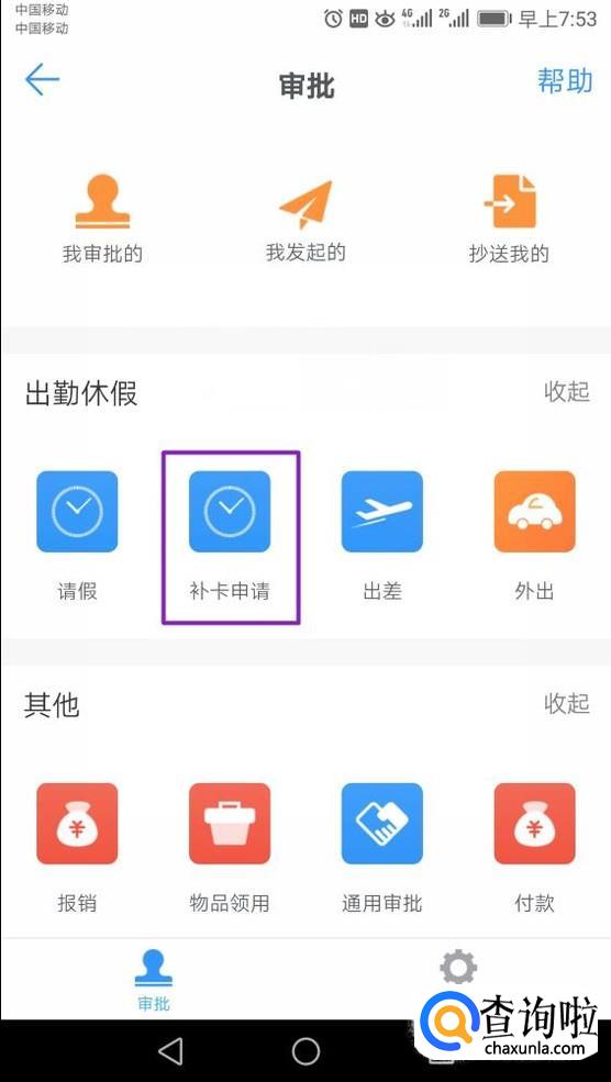 查看补卡的进度的话,我们点击审批里面的我发起的;