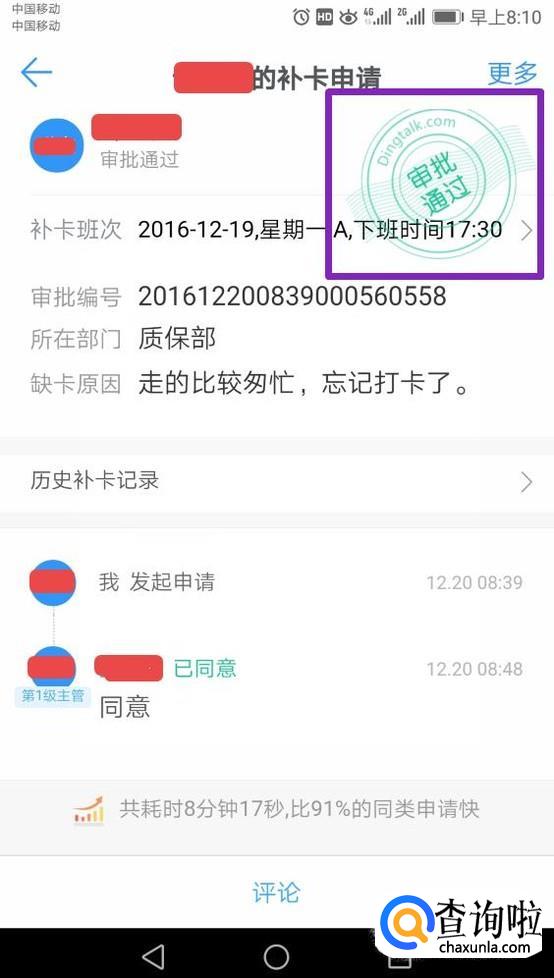 之后我们在里面就可以看到我们发起的审批了,如果通过的话,会显示审批通过,如图所示;