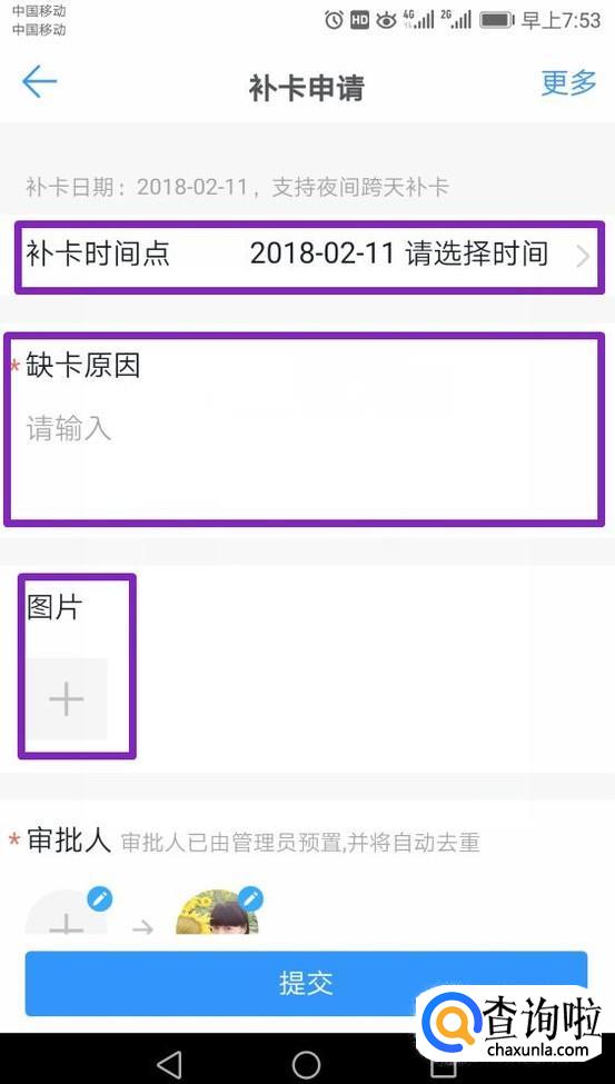 弹出的界面,我们填写补卡时间点,缺卡原因,如果有图片的话,就上传图片,点击选择审批人,如果有抄送的人的话,就选择抄送的人,最后点击提交;