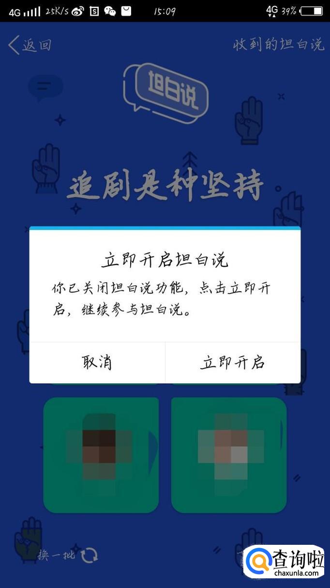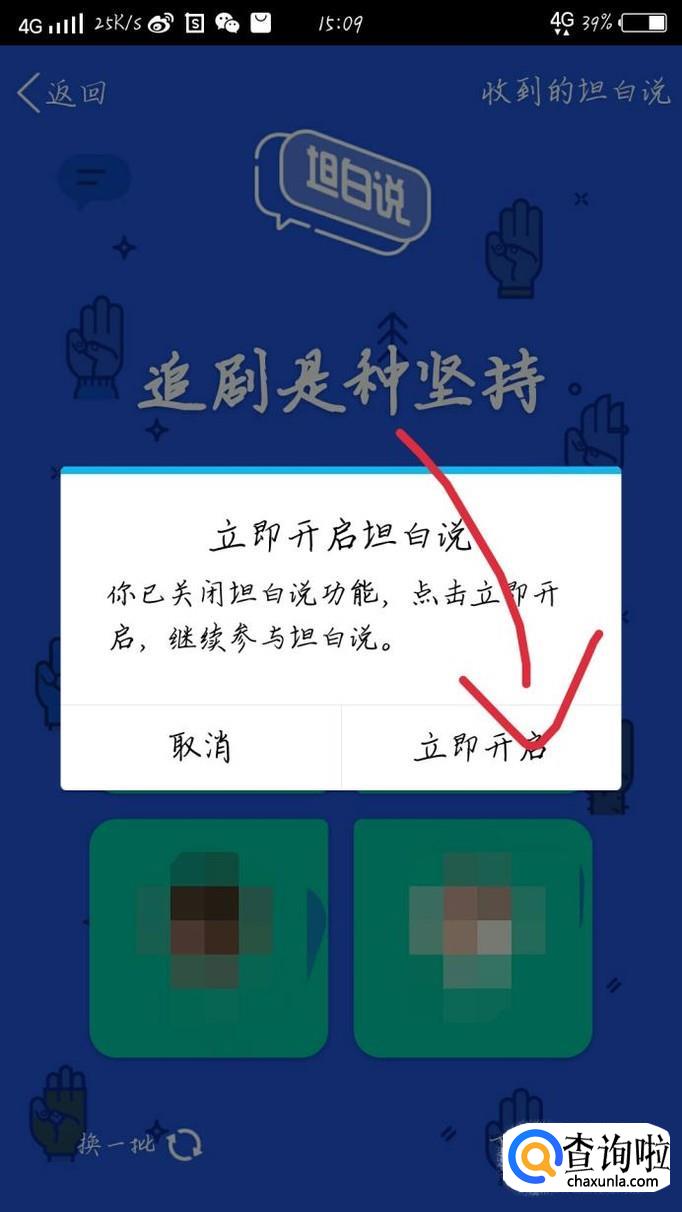 点击立即开启这个按钮,如图1箭头所示。开启后就直接可以进入QQ坦白说啦。