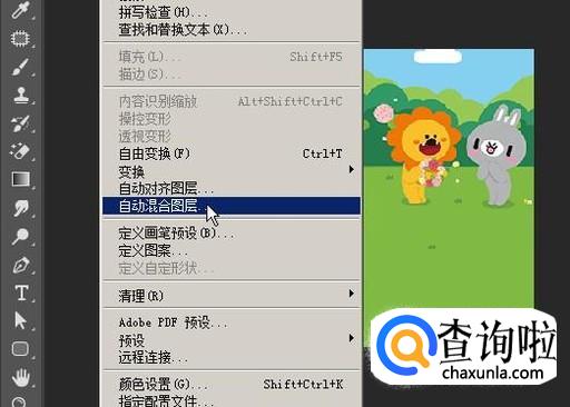 在弹出的下拉菜单中再点击:自动混合图层;弹出操作面板。