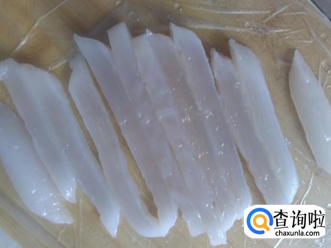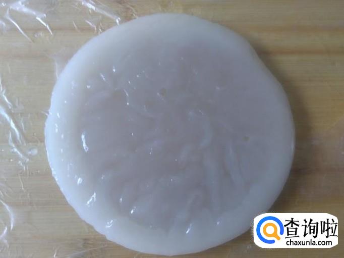 用一个保鲜袋铺到案板上,然后把晾凉的凉糕倒出来,用刀切成一条条粗条,切出来的凉粉一层层的,晶莹透明,非常好看。