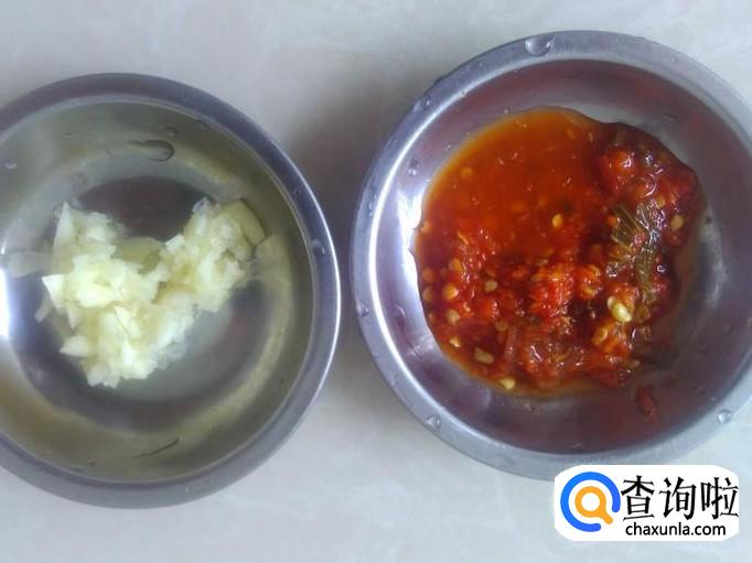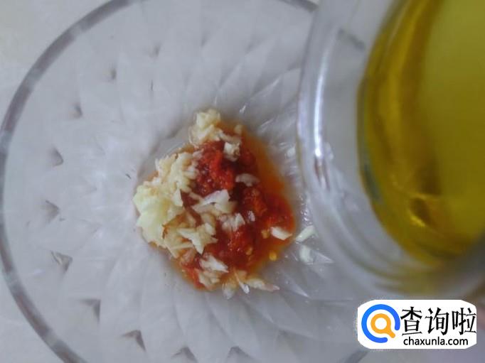 做调料,把蒜蓉、酸梅紫苏酱放到碗里,加2勺香油、1勺生抽搅拌均匀。