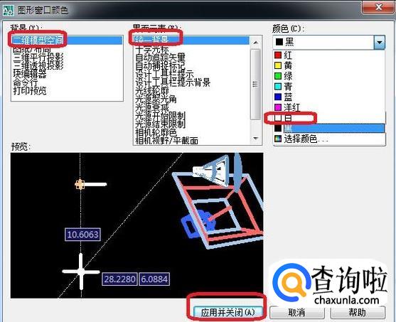 此时,就可以设置背景颜色了。选择背景(当前是二维模型)、界面元素,然后点击选择一种别的颜色,比如我以白色来演示。点击“应用并关闭”。