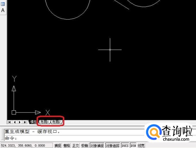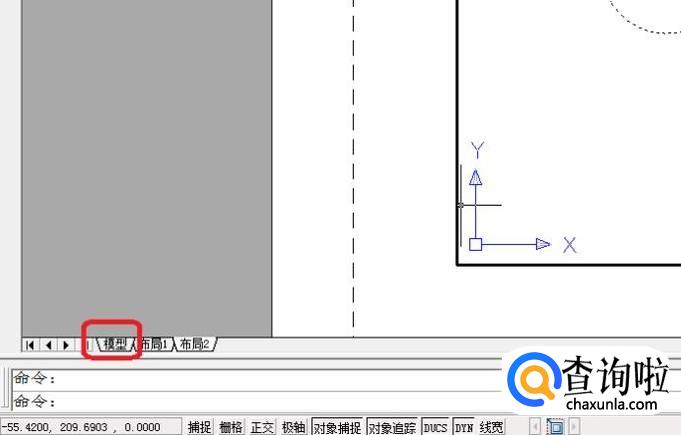 如图所示,屏幕左下角命令栏上方有“模型”、“布局1”、“布局2”三个按钮,点击“布局1”或“布局2”就能切换到布局,我们点击“布局1”。
