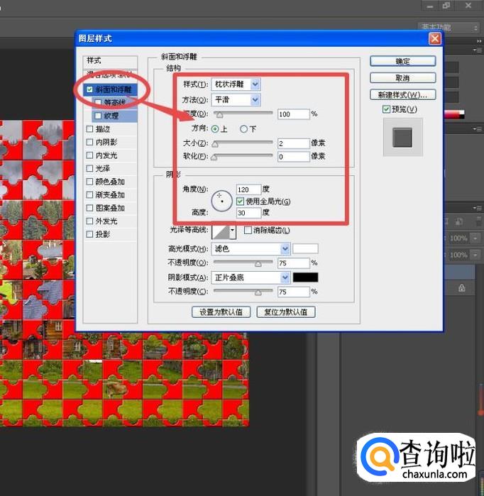 双击“图层1”,在图层样式对话框中添加“斜面和浮雕”选项,并根据实际效果设置各项参数;