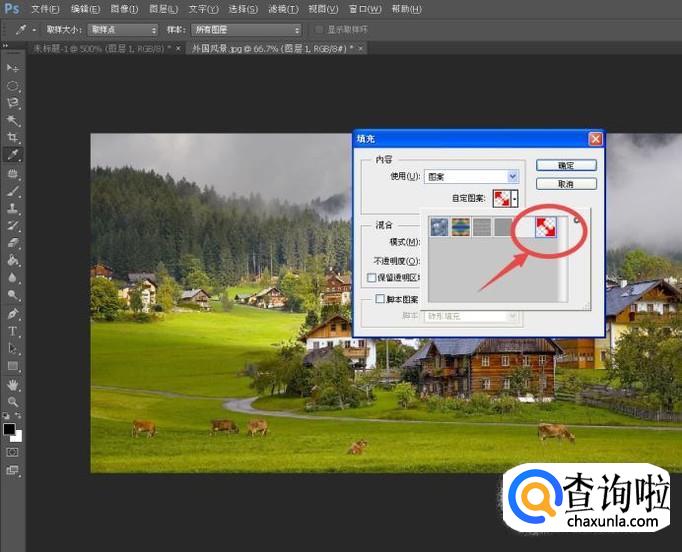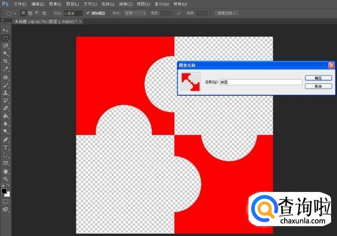 在工具栏中选用“魔棒工具”分别选取圆形,按“Delete”键删除黑色区域,接着点击“编辑-定义图案”,“确定”,如图所示;
