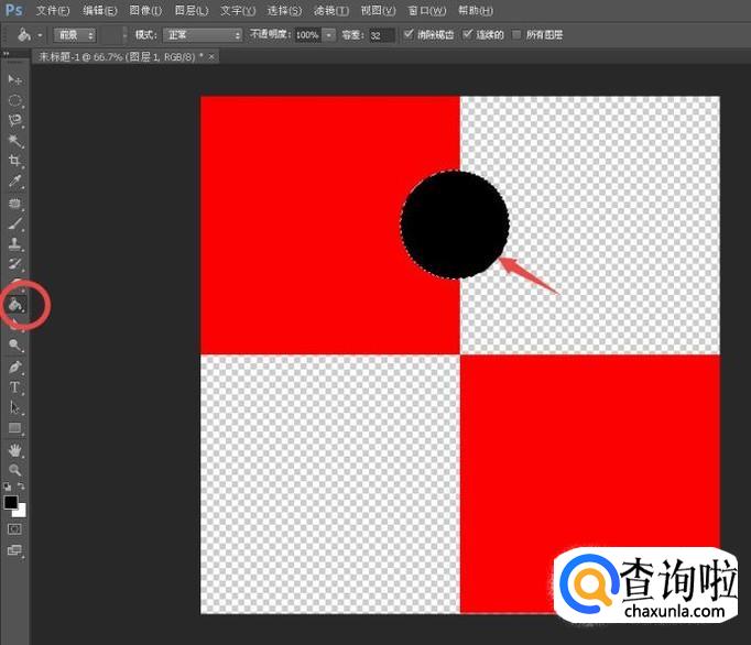 将“前景色”设置为“黑色”,接着用“填充工具”对圆形选区填充颜色;