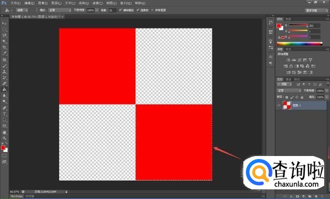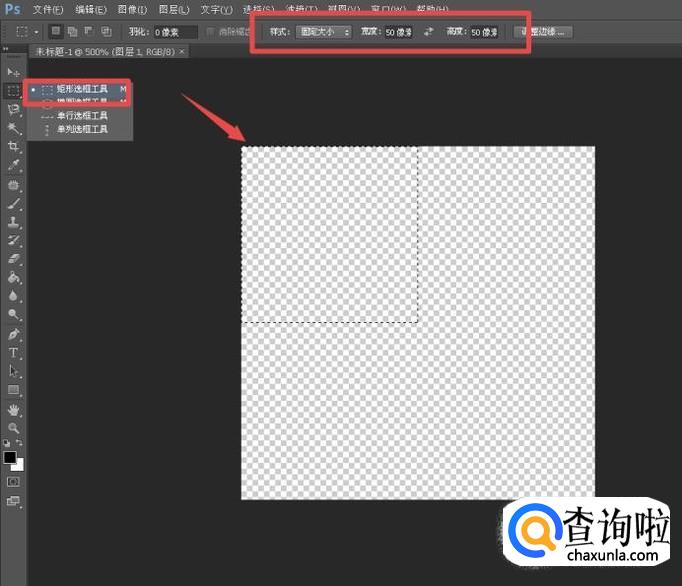在工具栏中选取“矩形选框工具”,把选项栏的“样式”定为“固定大小”,宽度和高度根据新建图层的一半数值进行设置,然后点击画面,生成选区;