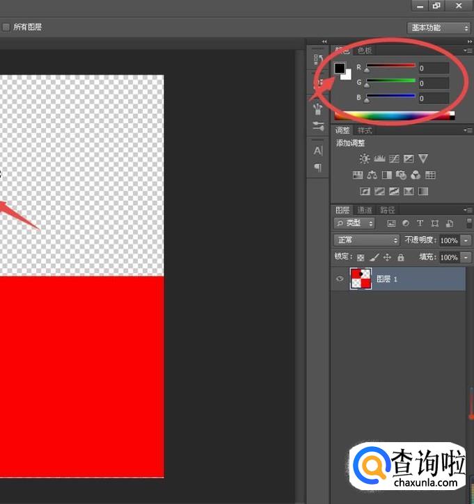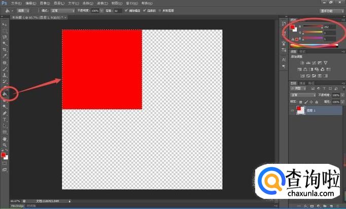 如图所示设置“前景色”:R252:、G1、B1,在工具栏中选用“填充工具”,对生成的选区进行填充;
