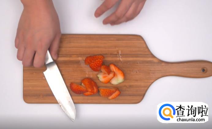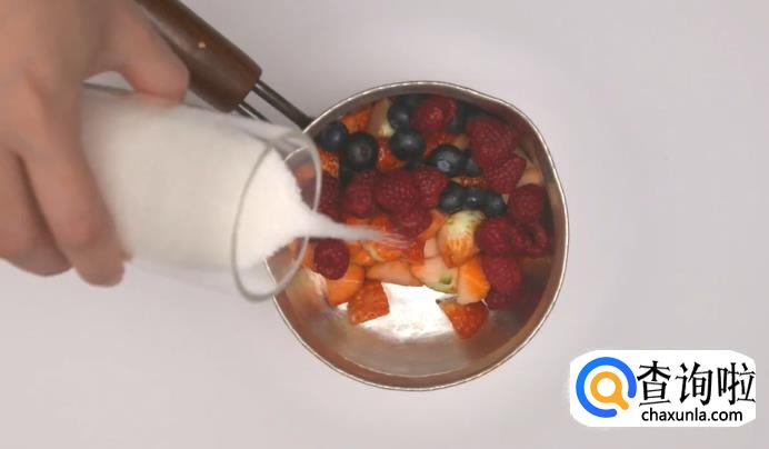 接着,将草莓切成小瓣,和蓝莓、树莓混合在一起(3种加一起共250克即可),并撒入250克的糖。