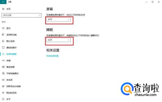 在“屏幕”以及“睡眠”的选项设置中均选择“从不”,即可避免电脑自动关闭屏幕和自动休眠。