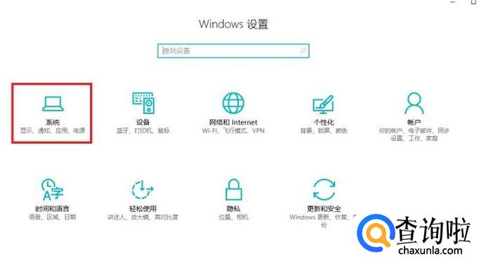 在Windows设置中,点击“系统(显示、通知、应用、电源)”选项。